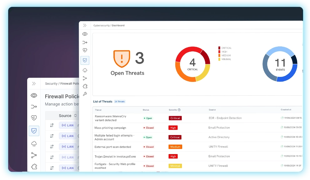 UNITY comes with an integrated nextGen firewall and security logs collector. We can provide you with even more security with either one of our cyber security plans.